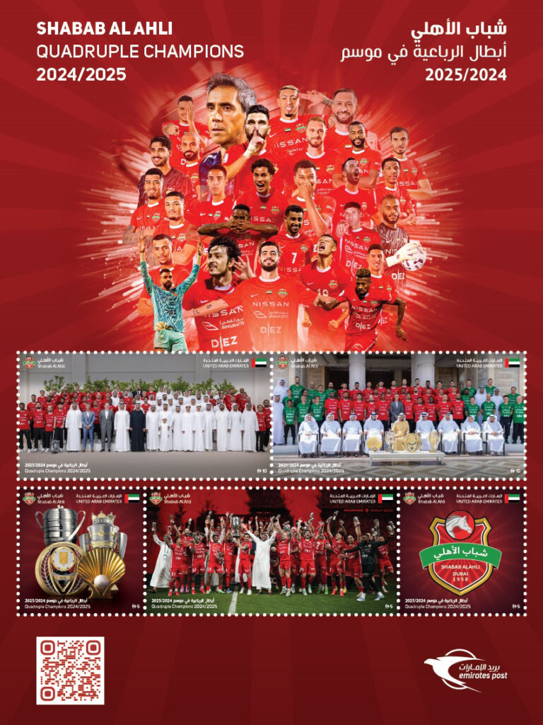 Emirates Post, in collaboration with Shabab Al Ahli Club, released a special commemorative stamp collection titled ‘Shabab Al Ahli Club – Quadruple Champions 2024/2025,’ celebrating the club’s historic achievement of winning four major titles in a single, remarkable season. This landmark success has established the ‘Fursan Al Humur’ (Red Knights) as one of the most successful teams in the UAE’s football history.