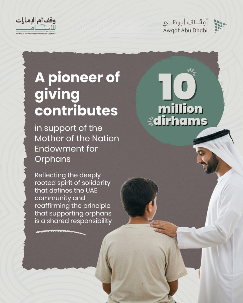 A pioneer of giving has contributed AED 10 million to the “Mother of the Nation Endowment for Orphans” initiative, launched by the Endowments and Minors’ Funds Authority – Awqaf Abu Dhabi under the patronage of His Highness Sheikh Mohamed bin Zayed Al Nahyan, President of the UAE.